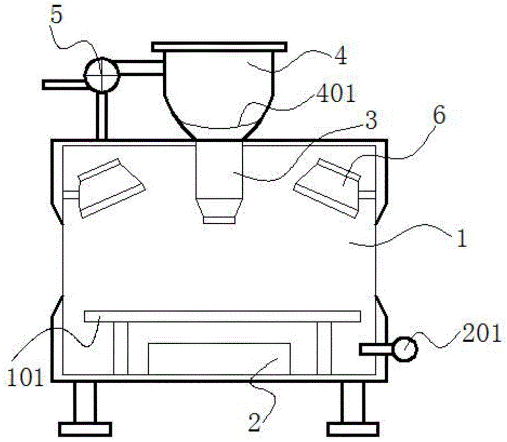 圖中:1、機(jī)殼;101、工作臺;2、電加熱箱;201、溫度傳感器;3、噴料嘴;4、料箱;401、警示線;5、吸粉泵;6、吸塵嘴;7、吸塵管;8、吸塵箱;9、控制面板;10、引風(fēng)機(jī);11、集塵布袋。